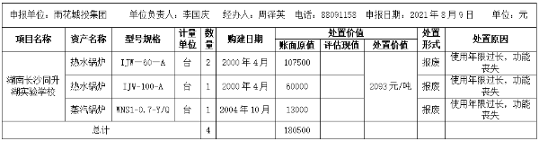 长沙市雨花城bob综合体育官网app下载设出资集团有限公司因资产核销所涉及湖南长沙同升湖实验学校停用锅炉设备资产需处置(核销),根据《关于明确区属行政事业单位资产处置审批权限有关事项的通知》雨财发﹝2021﹞7号文件精神,向社会公示。按照文件精神,现将长沙市雨花城bob综合体育官网app下载设出资集团有限公司所需处置(核销)的资产现场勘查(详情见下表)等情况,予以公示。公示时间为2021年8月10日至2021年8月17日。