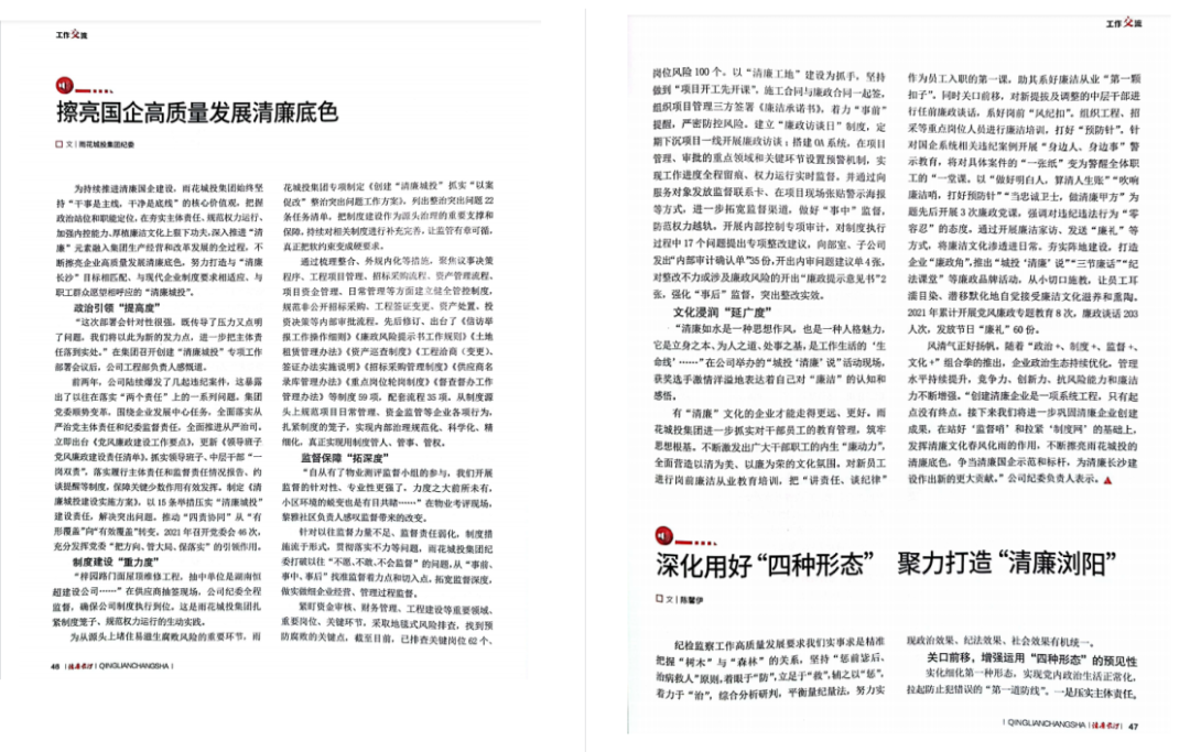 近日,中共长沙市纪委、市监委主办的《清廉长沙》(2022年第1期,总第22期),刊发雨花CSGO投注官网集团纪委文章《擦亮国企高质量发展清廉底色》,介绍我司如何推进“清廉”元素融入集团生产经营和改革发展的全过程,建筑“清廉CSGO投注官网”。